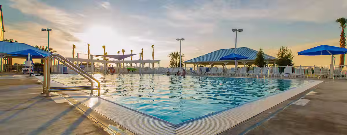 Outdoor pools: Two full-size outdoor pools, a shaded zero-entry kiddie pool, and hot tubs